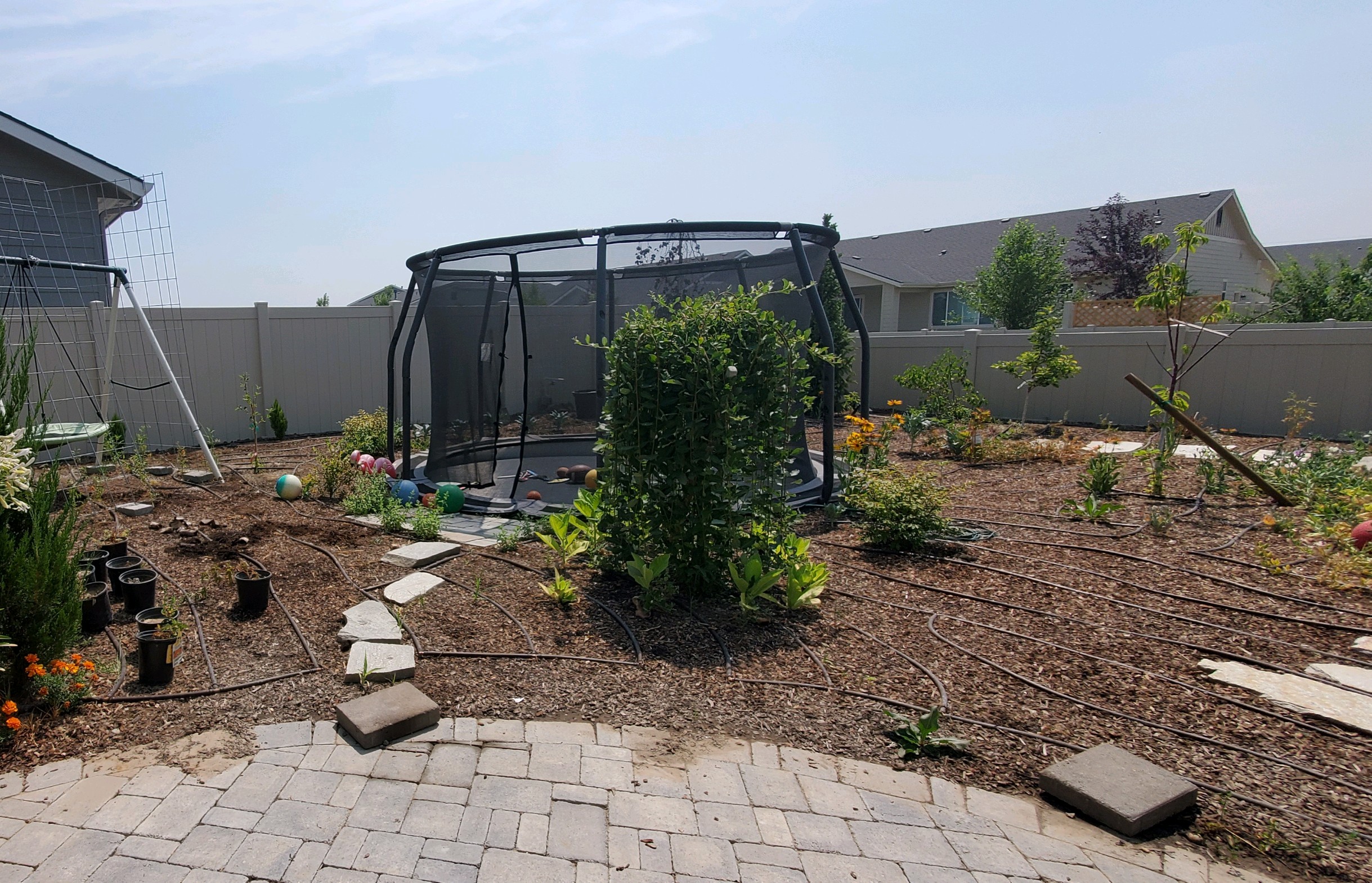 First thing we did was pluck the weeds. The builders did little other than throw their empty water bottles and cigarette butts on the ground. Because they didn’t put grass and plants in, weeds were everywhere. So we went out there with a big bucket and plucked them all right out of the ground. Time went by, and we dug a big hole for a pond, and laid out a border for the patio. Then we Winter came, and we stayed inside for a while. When mom had us get out there in the Spring, we found out the pond hole had caved in during the winter, so we dug it back out, and the started tracing the hole for the trampoline. Then dad got some sand and a compactor, and so we filled in the outline for the patio with the sand and compacted it down into a flat, hard surface. Dad then proceeded to buy a truckload of bricks for our patio. After a lot of work on dad’s part, we had a brick patio. Then mom filled the backyard with woodchips. Mom said it would look better after a while, and I’m pretty sure this is a “trust the process” kind of thing. Why? Because I think the backyard looks hideous with woodchips. You don’t have to mow it, which is an upside, but it looks really, really bad. Anyway, we dug a big hole, put the trampoline in it, then mom put in some drip irrigation lines and some plants. We also planted some raspberries, except the package lied to us and we actually planted blackberries.
